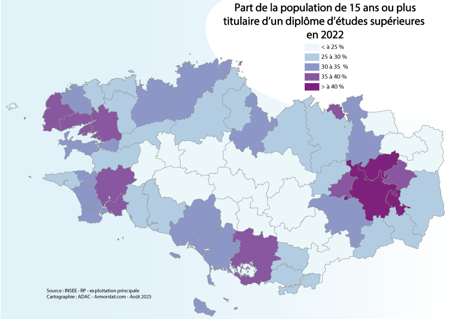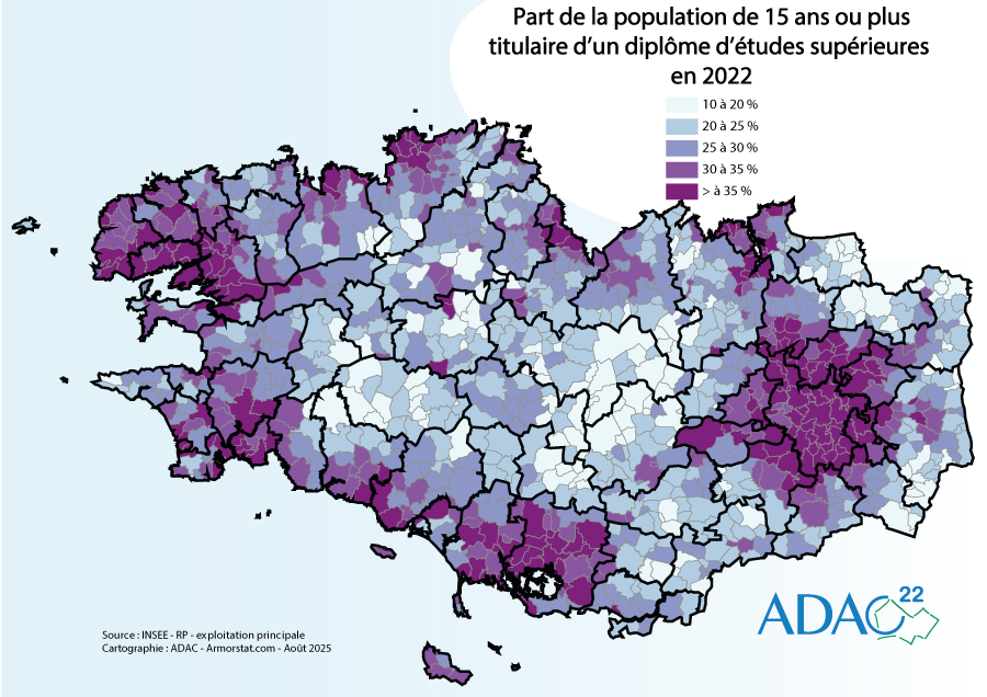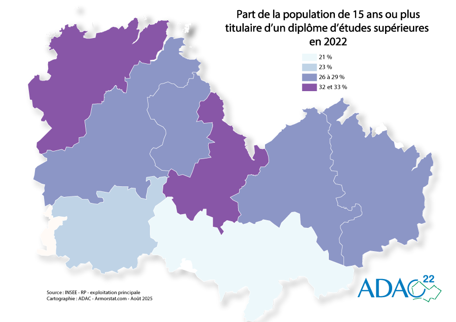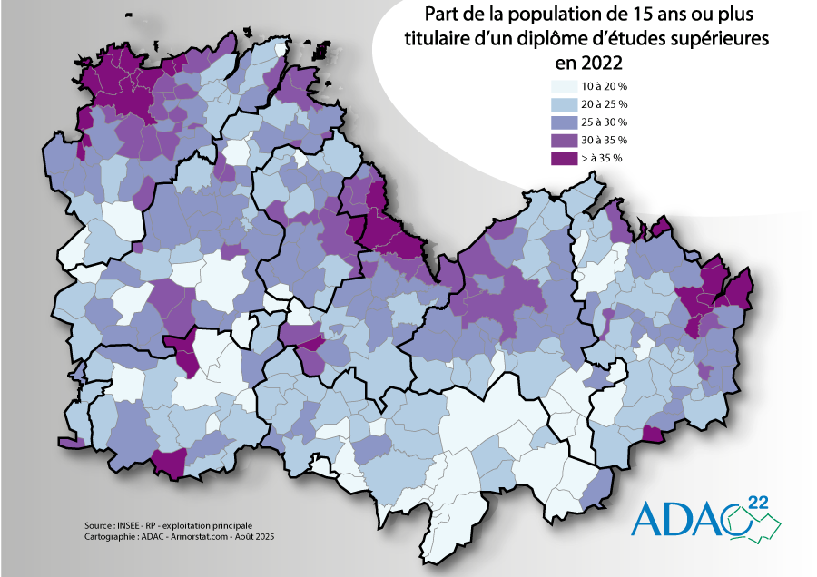 Entre les recensements de 1999 et 2022, le niveau global de formation de la population costarmoricaine de 15 ans et plus ayant terminé ses études s'est élevé (Source : INSEE, recensement de population). La part des personnes n’ayant aucun diplôme ou un BEPC (Brevet des collèges) est en effet passée de 49 à 23,7% tandis que celle des diplômés d’études supérieures a progressé de 14 à 28,8 %.