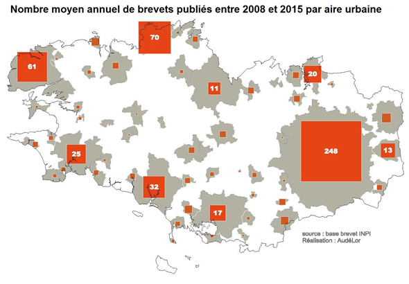 Une centaine de demandes de brevets est régulièrement publiée en Côtes d’Armor (100 en 2012, 122 en 2013, 105 en 2014), soit environ 20% des demandes déposées en Bretagne. Près des 2/3 proviennent de l’aire urbaine de Lannion : transmission d’informations numériques, télécommunications, techniques d’informatique… Orange est actuellement le plus gros pourvoyeur de brevets dans le département (Source : Base Brevet INPI, cartographie AUDELOR).