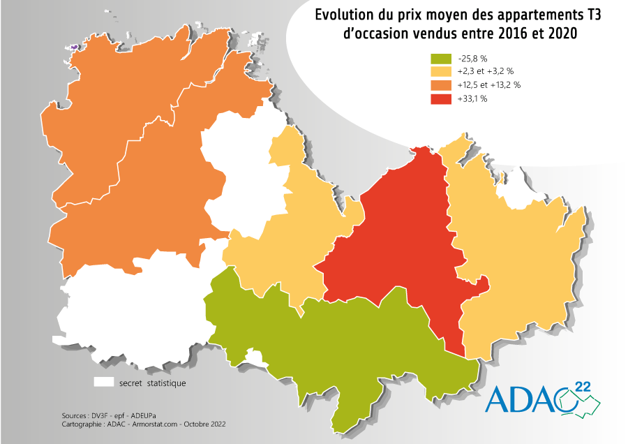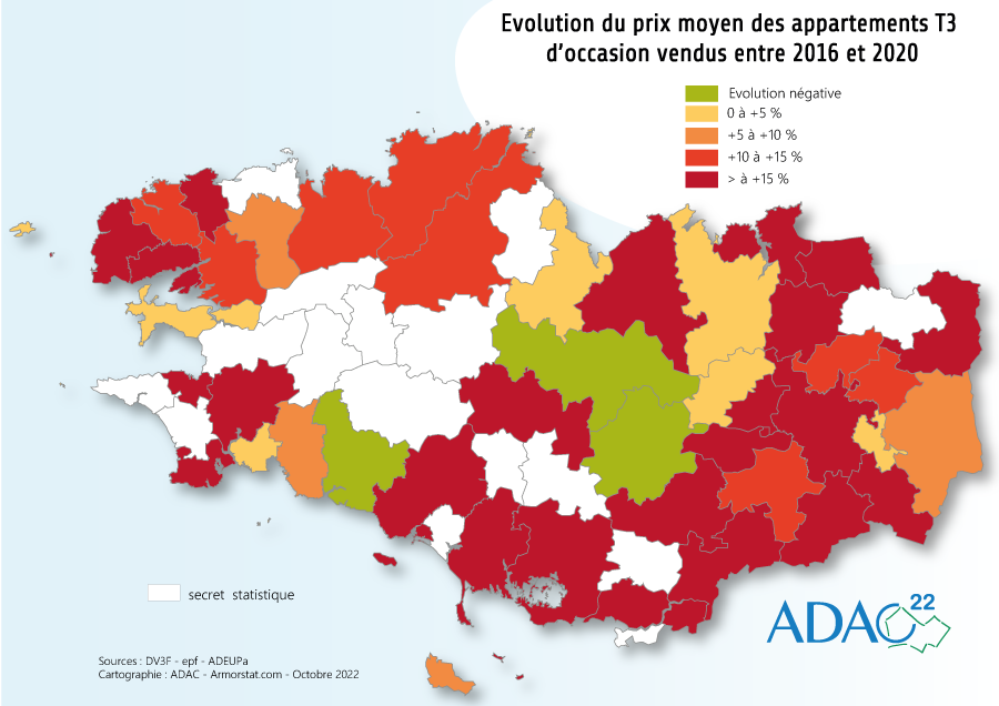Evolution du prix moyen des appartements T3 d'occasion vendus de 2016 à 2020 (%)